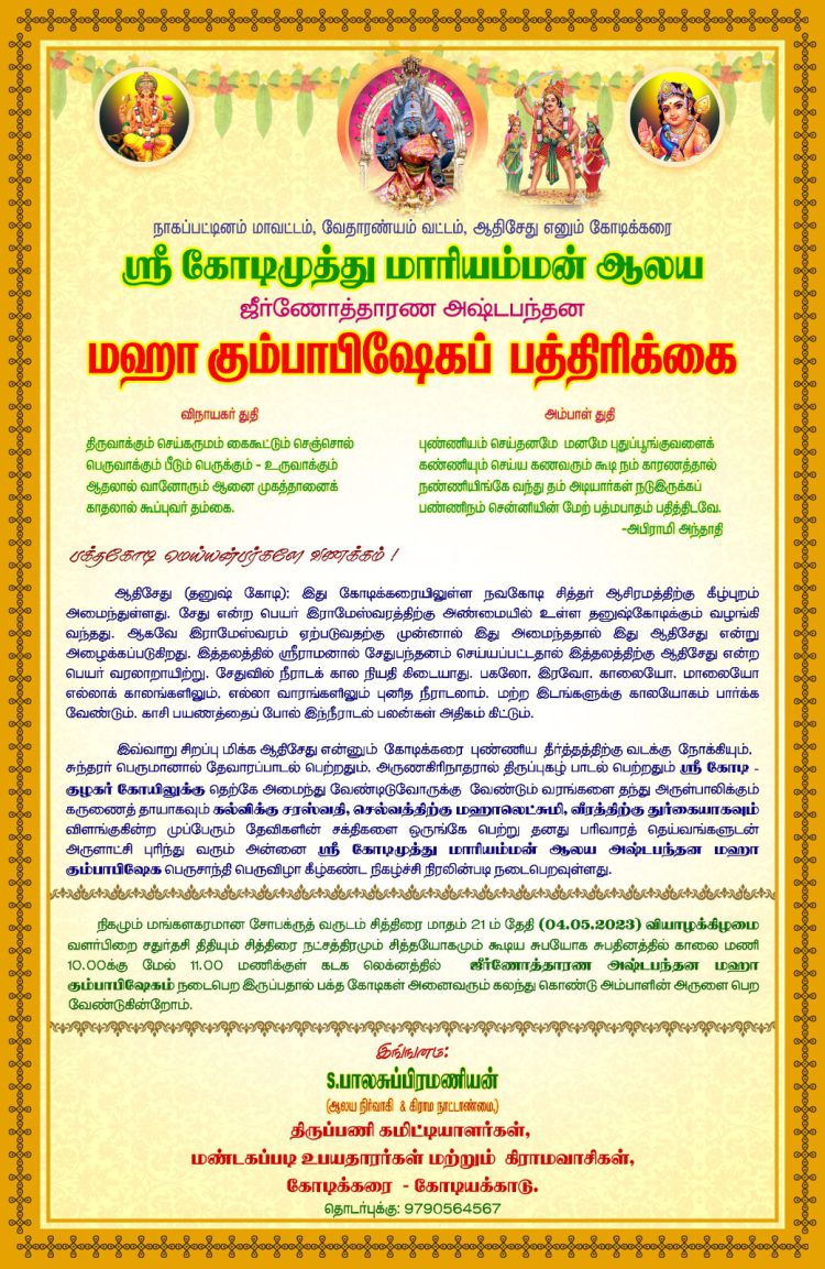 Uncategorizedசெய்திகள் தமிழ்நாடு வேதாரணியம் கோடிமுத்து மாரியம்மன் ஆலய மகா கும்பாபிஷேகம் By admin - April 28, 2023 0 331 views Share FacebookTwitterPinterestWhatsApp அ