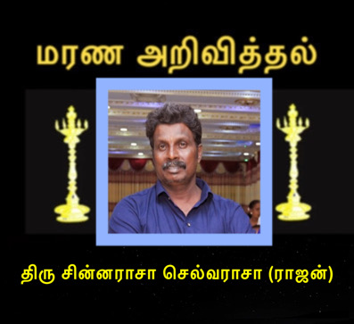 மன்னார் உயிலங்குளத்தை பிறப்பிடமாகவும் மதவடி வல்வெட்டித்துறையை வசிப்பிடமாகவும் கொண்ட அமரர் சின்னராசா செல்வராசா (ராஜன்) அவர்கள் இன்று அதிகாலை 27/08/2023 ஞாயிற்றுக்கிழமை அன்று காலமானார். அன்னார் அமரர்களான சின்னராசா செல்வரத்தினம் அவர்களின் அன்பு மகனும் நடனசிகாமணி (நடனி) அமரர் கலாநிதிதேவி (கலா) அவர்களின் மூத்த மருமகனும் அமரர் அருந்ததி அம்மாவின் அன்பு பெறாமகனும் விஜயராணி (ராணி) பாசமிகு கணவரும் செந்தூரன்(லணடன்),துவாரகா(கனடா) துஜேந்திரன் (துஜேன்), விதுஷன், அனோஷிகா ஆகியோரின் பாசமிகு தந்தையும், பிரகாஷ் (கனடா) அவர்களின் ஆசை மாமனாரும், சுகிர்தராணி (அம்மன்), ரவிச்சந்திரன்(ரவி),சந்திரலிங்கம், காலஞ்சென்றவர்களான இந்திராதேவி, உதயகுமார்(உதயன்) ஆகியோரின் பாசமிகு சகோதரனும், ராஜன்,பாலுக்குட்டி , கண்ணன் ,ரதி ,மீரா சுதன் ,சறோ,காலஞ்சென்ற ராவ் ஆகியோரின் மைத்துனரும் ,யோகா, மனோஜா ,சாந்தி, முரளி, குகா, சஜிதா, ஆகியோரின் உடன்பிறவா சகோதரரும் ஆவார். அன்னாரின் இறுதிக்கிரியைகள் 28/08/2023 திங்கட்கிழமை அன்று பிற்பகல் 4 மணியளவில் அவரது இல்லத்தில் நடைபெற்று தகனக்கிரியைக்காக ஊறணி இந்து மயானத்திற்கு எடுத்துச்செல்லப்படும் என்பதனை உற்றார், உறவினர், நண்பர்கள் அனைவருக்கும் அறியத்தருகின்றோம்.