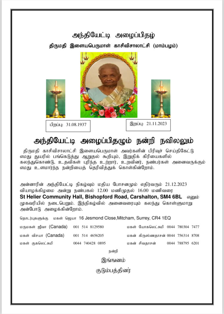 அறிவித்தல்கள்செய்திகள் அந்தியேட்டி அழைப்பிதழ்- அமரர் திருமதி இளையபெருமாள் காசிவிசாலாட்சி(மாம்பழம்) By admin - December 18, 2023 0 339 views Share FacebookTwitterPinterestWhatsApp