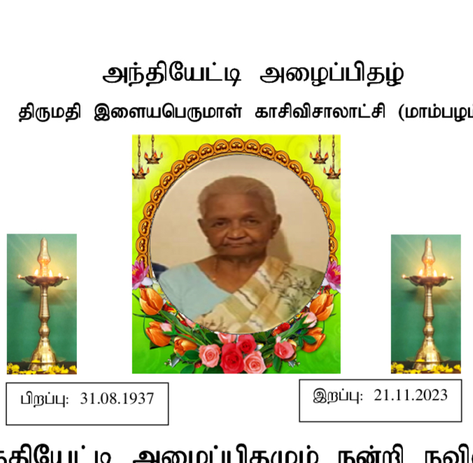 அந்தியேட்டி அழைப்பிதழ்- அமரர் திருமதி இளையபெருமாள் காசிவிசாலாட்சி(மாம்பழம்)