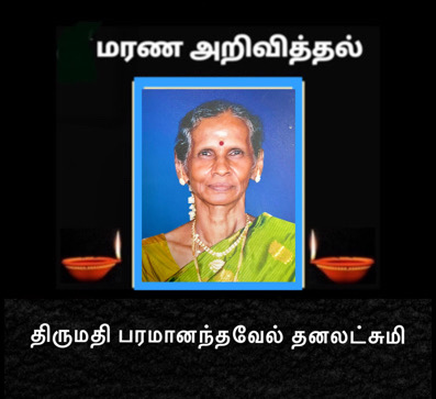 வல்வெட்டித்துறை மதவடியை பிறப்பிடமாகவும் சிவபுரவீதியை வசிப்பிடமாகவும், தற்போது இந்தியா திருச்சி சீனிவாச நகரை வதிவிடமாகவும் கொண்ட திருமதி பரமானந்தவேல் தனலட்சுமி அவர்கள் கடந்த திங்கட்கிழமை இறைவனடி சேர்ந்தார்.