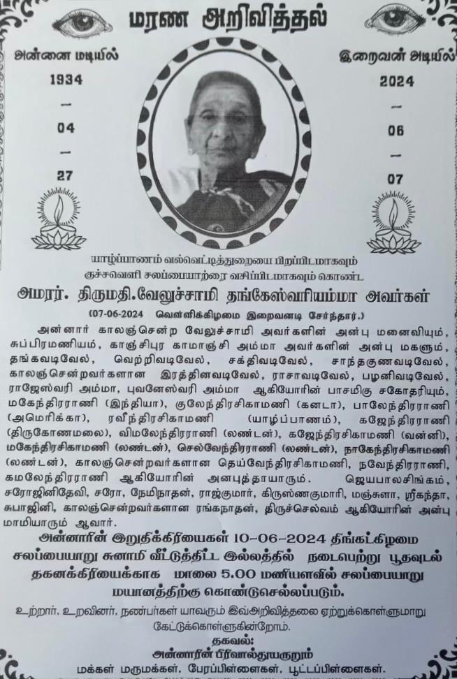 அறிவித்தல்கள்செய்திகள் மரணஅறிவித்தல் –திருமதி வேலுச்சாமி தங்கேஸ்வரியம்மா By admin - June 10, 2024 0 380 views Share FacebookTwitterPinterestWhatsApp