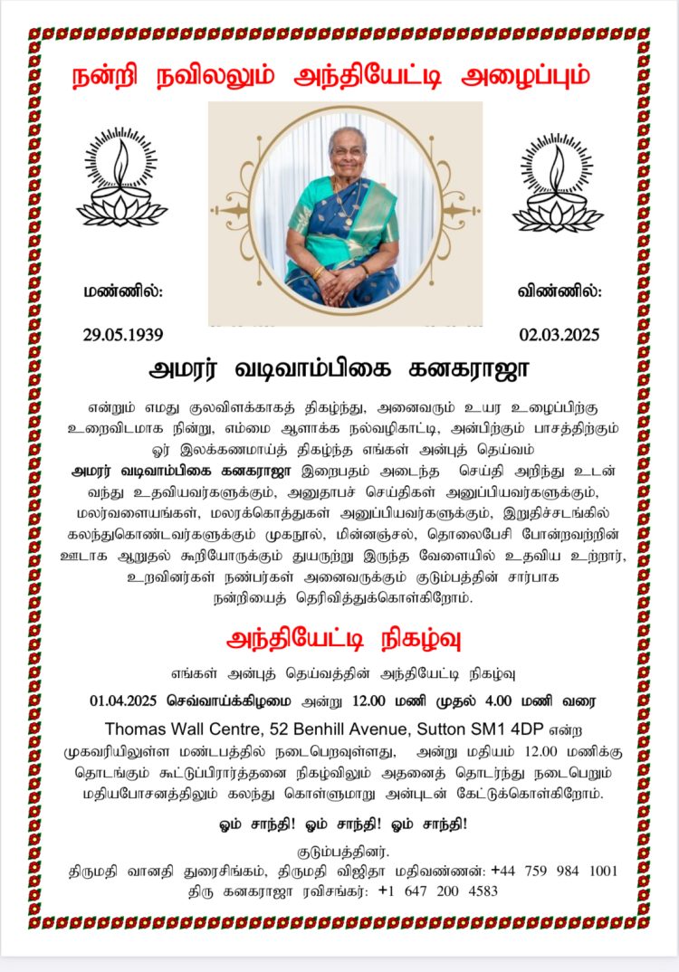 அறிவித்தல்கள்செய்திகள் அந்தியேட்டி அழைப்பிதழ்-அமரர் திருமதி வடிவாம்பிகை கனகராஜா By admin - March 25, 2025 0 536 views Share FacebookTwitterPinterestWhatsApp