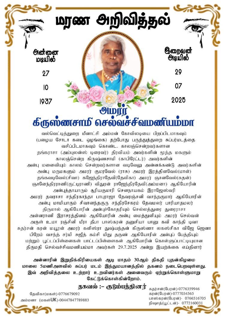 அறிவித்தல்கள்செய்திகள் மரண அறிவித்தல்-திருமதி கிருஸ்ணசாமி செல்வச்சிவமணியம்மா By admin - July 30, 2025 0 429 views Share FacebookTwitterPinterestWhatsApp