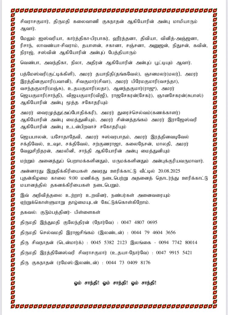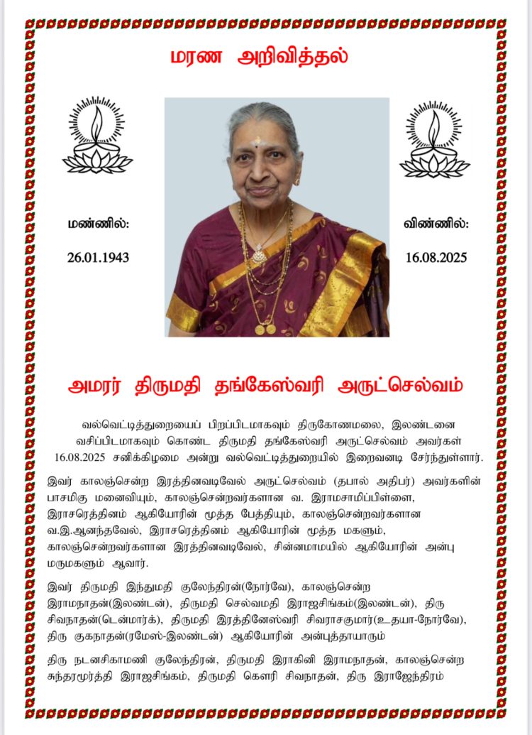 அறிவித்தல்கள்செய்திகள் மரண அறிவித்தல்- திருமதி தங்கேஸ்வரி அருட்செல்வம் By admin - August 17, 2025 0 502 views Share FacebookTwitterPinterestWhatsApp