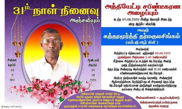 செய்திகள் அந்தியேட்டி அழைப்பிதழும் நன்றி நவிலலும்- அமரர் சுந்தரமூர்த்தி தர்மகுலசிங்கம்(MGR கிளி) By admin - August 29, 2025 0 1,432 views Share FacebookTwitterPinterestWhatsApp