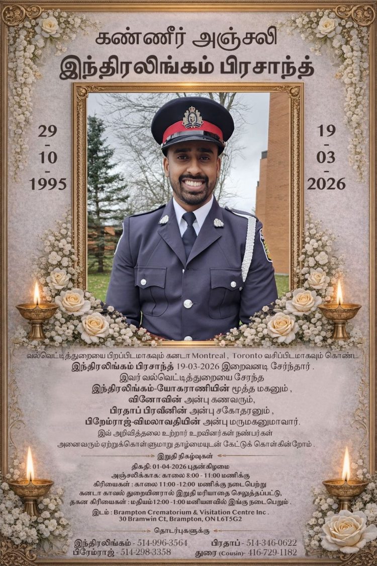 செய்திகள் மரண அறிவித்தல்- திரு இந்திரலிங்கம் பிரசாந்த் By admin - March 30, 2026 0 122 views Share FacebookTwitterPinterestWhatsApp