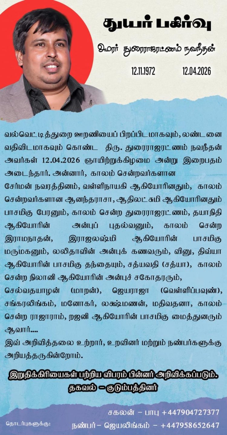 Uncategorized துயர் பகிர்வு – திரு துரைராஜரட்ணம் நவநீதன் By admin - April 14, 2026 0 58 views Share FacebookTwitterPinterestWhatsApp